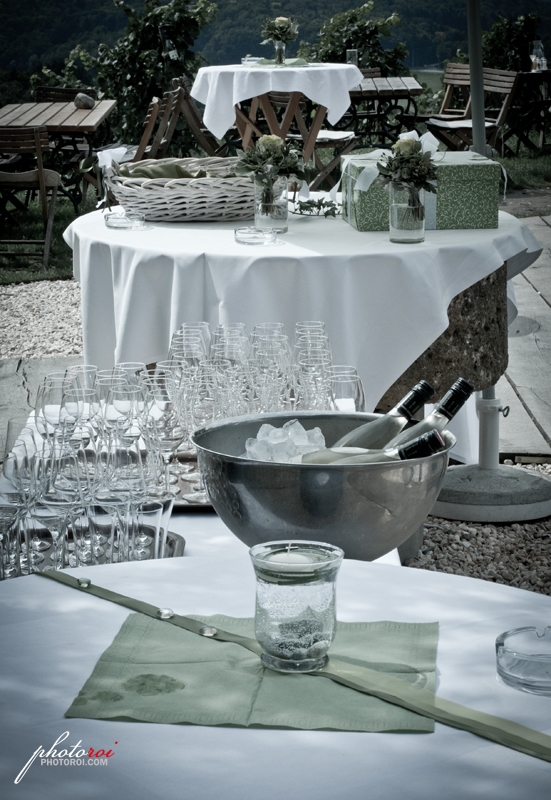Nach diverser weiterer Fotos der Gäste, einem ersten Gruppenfoto im Weinberg, einem Gruppenfoto in Herzform und Glückwünschen, begab sich die Hochzeitsgesellschaft auf die Dachterrasse zur Agape und dort machten wir mit den Gästen zusammen tolle Familienfotos und alle hatten ihren Spaß dabei. Dann gingen Daniela, Martin und ich noch einmal kurz in den Weinberg, um noch ein paar Reben-Fotos zu machen, ehe der Abend durch das große Essen eingeläutet wurde.